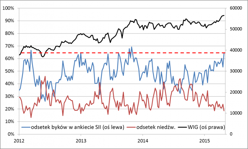 Jak widać historycznie wskaźnik był bardzo skutecznym barometrem nastrojów, a przekroczenie poziomu 63% zawsze trafnie zapowiadało korektę spadkową, w trakcie której nastroje ulegały przejściowemu schłodzeniu (na skutek którego odsetek byków zawsze spadał poniżej poziomu 50%).