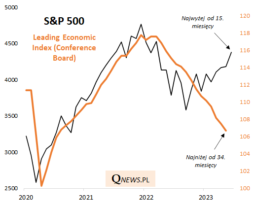 Zacznijmy od USA. Najnowszy odczyt wskaźnika wyprzedzającego (Leading Economic Index, LEI) Conference Board okazał się najniższy od ... 34 miesięcy. Tymczasem giełdowy indeks S&P 500 jest w okolicy poziomu ... najwyższego od 15 miesięcy.