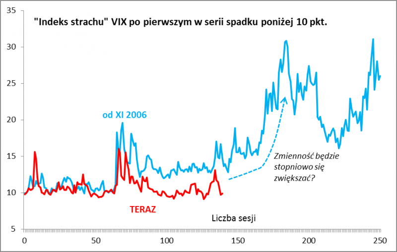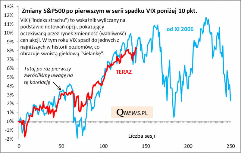 Odwołajmy się do historycznego porównania, jakie po raz pierwszy zaproponowaliśmy w lipcu br. Pokazaliśmy wtedy, że tegoroczne zachowanie amerykańskiego S&P 500 po spadku "indeksu strachu" (VIX) poniżej bardzo niskiego pułapu 10 pkt. bardzo przypomina poprzedni taki epizod z końca 2006 roku. Okazuje się, że po czterech miesiącach od tamtej analizy zarówno S&P 500, jak i VIX w przybliżeniu ciągle kroczą ścieżką sprzed ponad dziesięciu lat. Gdyby tak miało być nadal, to bieżący rok amerykański indeks "powinien" kończyć na nowych historycznych rekordach...