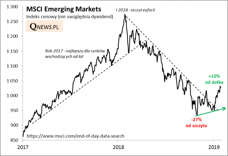 Ledwie zdążyliśmy napisać o wycenach akcji na rynkach wschodzących i o tym, że na dłuższą metę rodzimy WIG jest kopią inwestycji na emerging markets, a właśnie pojawił się nowy raport banku J.P.Morgan dotyczący tej grupy rynków. Trzeba przyznać, że stratedzy JPM mieli dużo racji jeśli chodzi o emerging markets na przestrzeni ostatnich lat. Przed rokiem byli - trafnie - dość sceptycznie nastawieni, by we wrześniu zmienić nastawienie na pozytywne ("przeważaj"). Wkrótce potem, w październiku indeks MSCI EM ustanowił dołek i jest już ponad 10% powyżej niego.