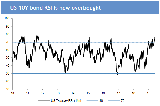 Jednocześnie pokazują, że na rynkach obligacji stało się coś zupełnie odwrotnego - osiągnęły stan silnego wykupienia po majowym rajdzie, w trakcie którego spadek rentowności (na skutek obaw przed negatywnym wpływem wojen handlowych na gospodarki) oznaczał wzrost cen papierów.