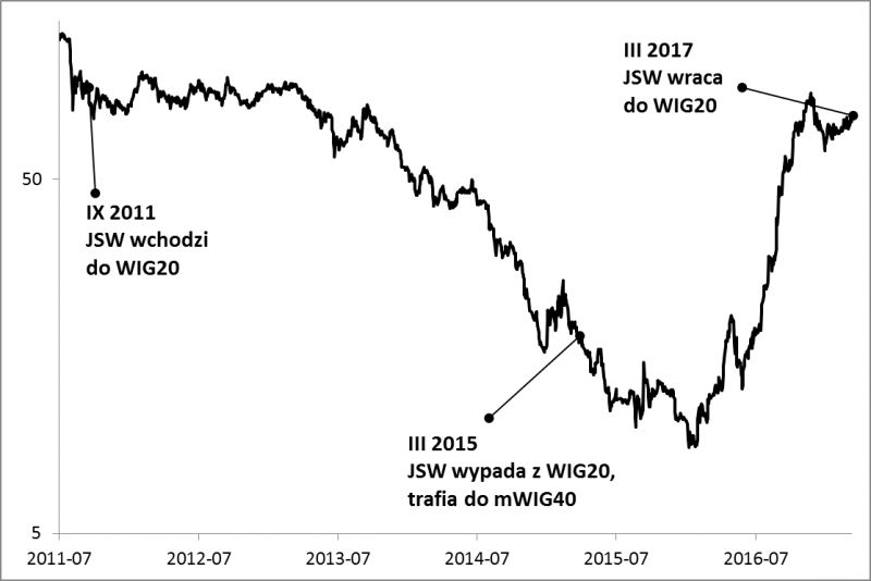 Po piątkowej sesji do grona WIG20 w ramach rocznej rewizji powróci niczym Feniks z popiołów górniczy koncern JSW. Dzieje tej spółki to prawdziwy rollercoaster. Do WIG20 trafiła wkrótce po giełdowym debiucie we wrześniu 2011 r. W marcu 2015 została z indeksu wyrzucona po długotrwałym załamaniu notowań. W 2016 odżyła, stając się jedną z lokomotyw ... mWIG40. Teraz "w nagrodę" powraca do WIG20.