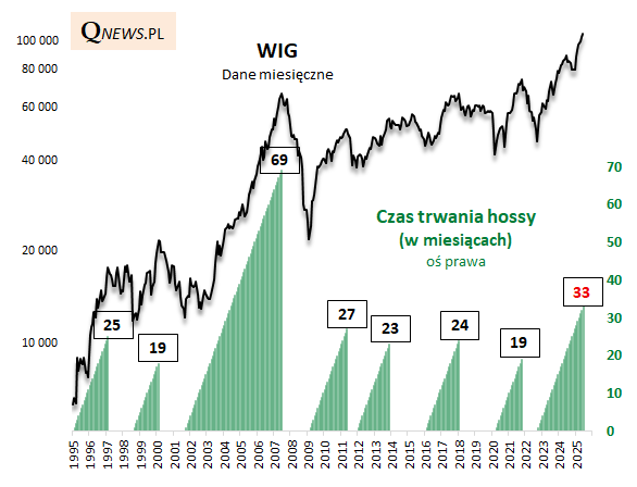 W oczy rzuca się fakt, że obecna hossa jest dłuższa niż jakakolwiek inna hossa z przeszłości, z wyjątkiem jednej - tej z lat 2001-2007, która trwała aż ... 69 miesięcy (można by powiedzieć, że była to "podwójna" hossa).