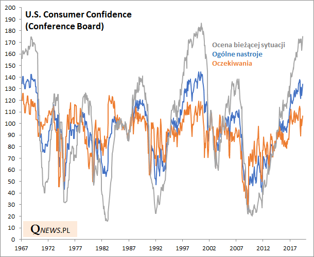 Od grudnia humory amerykańskich konsumentów stały się dość zmienne, jeśli wierzyć znanemu wskaźnikowi Conference Board. Szczególnie uwagę zwraca subindeks pokazujący oceny bieżącej sytuacji, który jeszcze w marcu tąpnął ze szczytów, a teraz ... znów sięgnął po nowe maksimum. Jest najwyżej od ... 2000 roku.