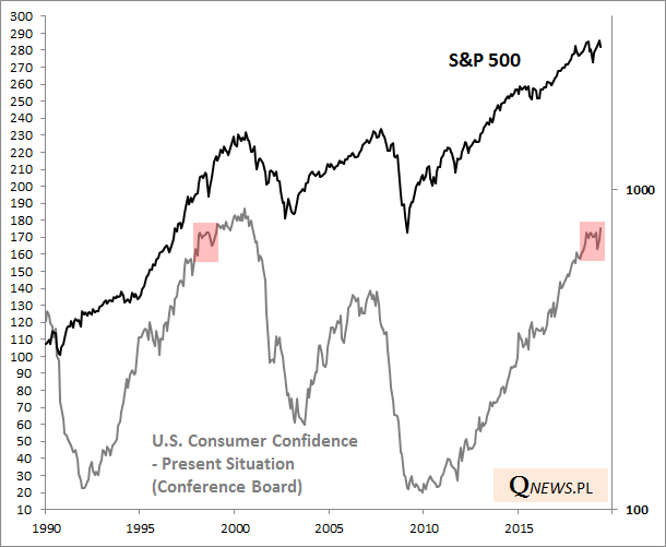 Subindeks ocen bieżącej sytuacji do bicia rekordów powrócił dokładnie w lutym 1999 roku. Stamtąd pozostał jeszcze mniej więcej rok na kontynuację hossy na Wall Street i innych rynkach.