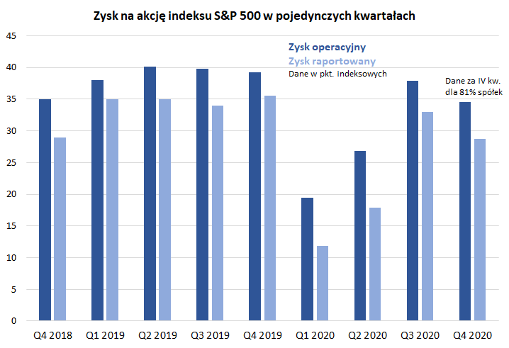Na początek przyjrzyjmy się wynikom w pojedynczym kwartale. Wg cząstkowych danych zysk operacyjny („oczyszczony”) przypadający na S&P 500 wyniósł niecałe 35 pkt. indeksowych. Oznacza to, że był o 12 proc. mniejszy niż w IV kwartale 2019. W przypadku zysku raportowanego (z reguły niższego, a przy tym bardziej chwiejnego niż operacyjny) spadek wyniósł wstępnie 19 proc.