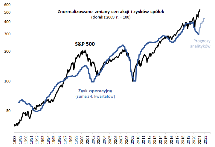 Wszystko wskazuje na to, że IV kwartał 2020 przypieczętował spadek zarobków firm z S&P 500 rok do roku, a począwszy od trwającego I kwartału tendencja odmieni się na pozytywną. Jak na razie w kontynuacji hossy nie przeszkadza fakt, że amerykański indeks giełdowy jest dużo wyżej niż teoretycznie powinien być na bazie historycznej korelacji z zyskami spółek.