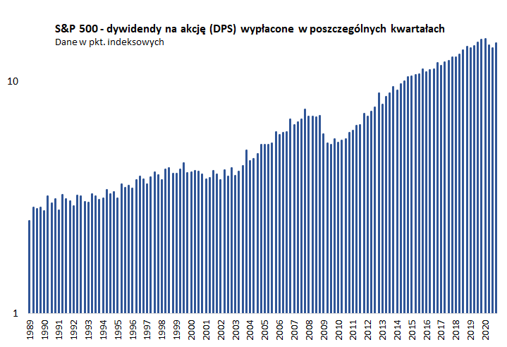 To są bez wątpienia dobre wiadomości. Amerykańskie korporacje wg oczekiwań mają już za sobą spadek zysków, a teraz powinny dynamicznie powracać do dobrej formy. Dodać do tego można to co pokazujemy na trzecim wykresie – w odróżnieniu od zysków z natury bardziej stabilne dywidendy wypłacane przez korporacje zaczęły już powracać w kierunku rekordowego poziomu. To z pewnością „bycza” tendencja.