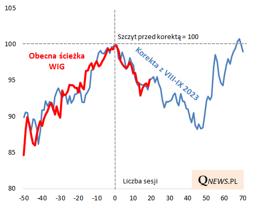 Najpierw odwołajmy się do porównania styczniowej przeceny z najgłębszą zniżką z ostatnich kilkunastu miesięcy, czyli tą z sierpnia-września 2023. Porównanie to jest o tyle uzasadnione, że ciągle widać tu uderzające podobieństwo. To porównanie sugerowałoby, że za nami już pierwsza faza korekty, ale już niebawem mogłaby się rozpocząć kolejna faza, sprowadzająca WIG na jeszcze nieco niższe poziomy.