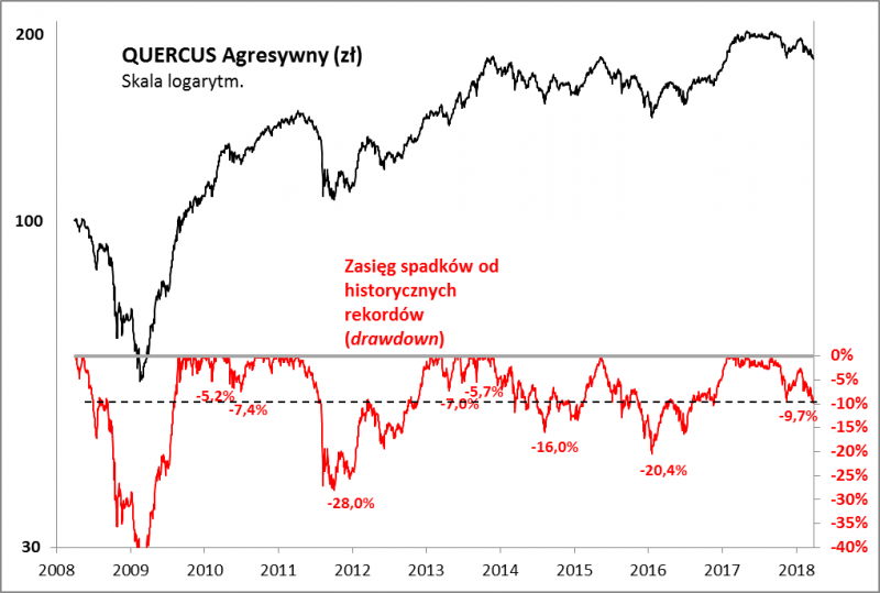 W połowie grudnia ub.r. zwracaliśmy uwagę, że cena jednostki funduszu QUERCUS Agresywny znalazła się ponad 9% poniżej historycznego rekordu (tzw. obsunięcie), przytaczaliśmy historyczne statystyki. Do tematu warto powrócić, bo po ostatnich turbulencjach rynkowych korekta pogłębiła się - obsunięcie powiększyło się już prawie do 10% (po poniedziałkowej sesji).