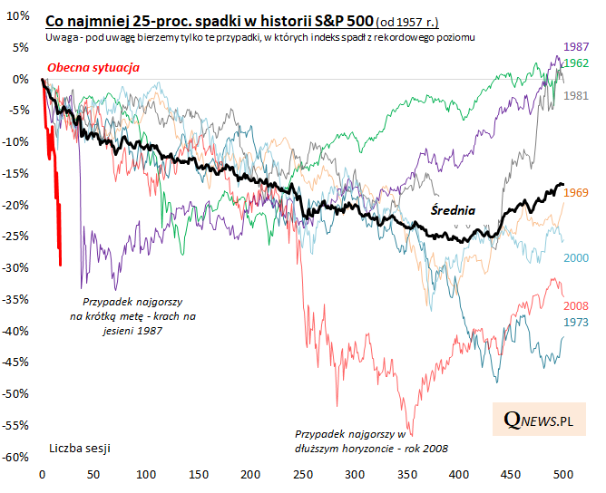 Po poniedziałkowej sesji, która przyniosła niemal 12-proc. spadek S&P 500, znów musimy zaktualizować wykres pokazujący obecną przecenę na tle historycznych ścieżek. Od szczytu amerykański indeks runął już o prawie 30%. Tempo jest ciągle rekordowo szybkie, natomiast już "tylko" kilku procent brakuje, by obecny krach dorównał głębokością temu z jesieni 1987.