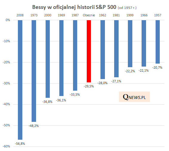 Reasumując, amerykańskie akcje przeceniły się już niemal o 30% od szczytu. To oznacza, że obecna - rekordowo szybka - bessa jest już szóstą najgłębszą na przestrzeni ostatnich ponad 60. lat.