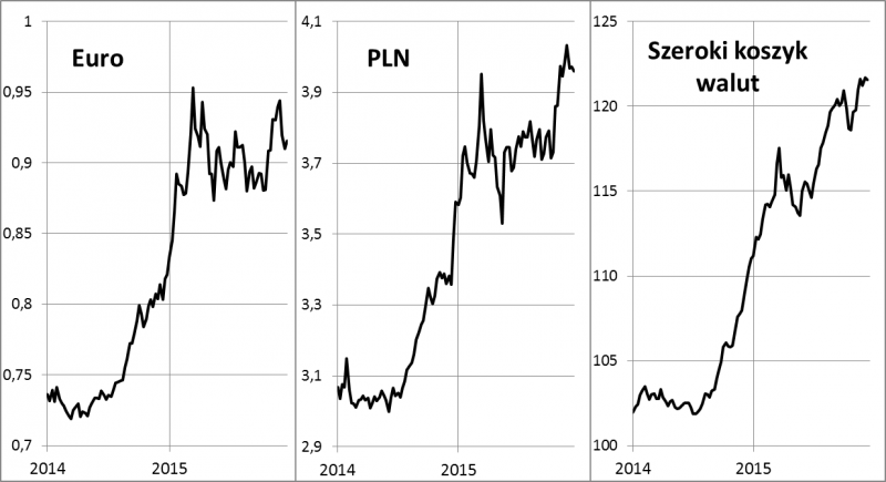 Końca dobiega drugi rok umocnienia dolara względem większości innych walut. Z naszych wyliczeń wynika, że w tym roku z punktu widzenia polskiego inwestora to właśnie dolar był jedną z najzyskowniejszych klas aktywów. Wygrał z polskimi akcjami, obligacjami, lokatami. W skali globalnej mocny dolar wywołuje rozmaite szeroko zakrojone konsekwencje: wywiera presję na spadek dolarowych cen surowców takich jak ropa czy miedź, przyczynił się do słabych stóp zwrotu z metali szlachetnych, a wreszcie wywołał obawy przed kryzysem zadłużenia w wielu krajach rozwijających się, gdzie długi rządów i firm są często denominowane właśnie w tej walucie. Tylko w tym roku dolar względem szerokiego koszyka walut ważonego udziałami w handlu zagranicznym umocnił się o ok. 10%, a przez dwa lata - o prawie 20%. W przypadku walut niektórych rynków wschodzących skala aprecjacji USD była jeszcze większa.