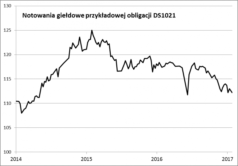 Co to dokładnie jest obligacja 5-letnia? Niekoniecznie taka, która została wyemitowana na 5 lat, lecz taka, która w danej chwili ma jeszcze ok. 5 lat do wykupu. Obecnie jest to w przybliżeniu np. papier DS1021 (wygasa w X 2021, czyli za ok. 4,8 roku). Jest on oprocentowany na 5,25%, ale przy cenie ok. 112 pkt. (czyli 12% powyżej wartości nominalnej) ma rentowność niespełna 3%.