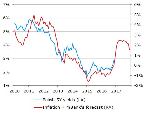 W tym względzie ciekawą projekcję zaprezentowali ostatnio analitycy mBanku. Ich zdaniem w najbliższym czasie wskaźnik inflacji może zostać wywindowany (m.in. właśnie pod wpływem efektu bazy) nawet w pobliże 2,5% (na marginesie - to cel inflacyjny Rady Polityki Pieniężnej). Analitycy wskazują, że historycznie z tempem inflacji dość silnie skorelowana była rentowność obligacji 5-letnich na rynku wtórnym.