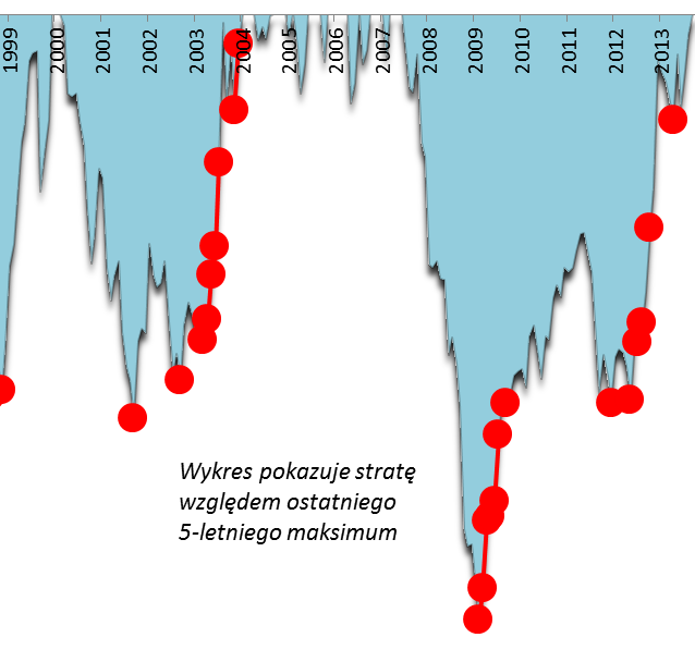 Na rys. 1 pokazujemy, w czym rzecz. Kiedy WIG osiągał punkty zaznaczone na czerwono, potem już nigdy nie powracał do nich. Innymi słowy, ktoś, komu udało się kupić zdywersyfikowany koszyk akcji w takich punktach, miał „zagwarantowane” zyski – nigdy nie był potem narażony na papierowe straty. Jasne staje się, że dążenie do kupowania w takich właśnie momentach powinno być celem każdego długoterminowego inwestora.