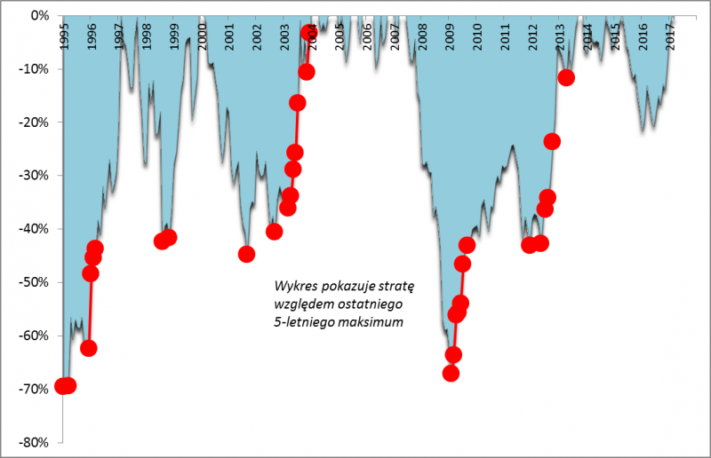 Spróbowaliśmy przełożyć tę ogólną obserwację na liczby. Czerwone punkty z wykresu WIG przenieśliśmy na wykres pokazujący głębokość spadku indeksu względem wcześniejszych szczytów.