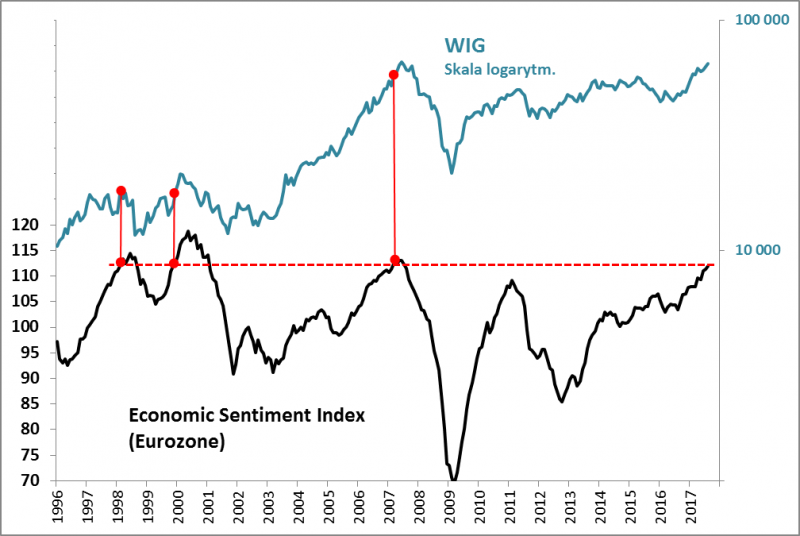 Czysto mechaniczna analiza tych danych prowadzi do prostego wniosku - jeśli wskazówki płynące z zachowania ESI są wiarygodne, to w najlepszym razie mamy jeszcze zaledwie kilka miesięcy na (możliwe, że dynamiczną) kontynuację hossy, a w najgorszym - szczyt jest już tuż-tuż (jak w 1998 r.). Czynnikiem, który by za tym przemawiał jest perspektywa zacieśniania polityki pieniężnej przez banki centralne w przyszłym roku.