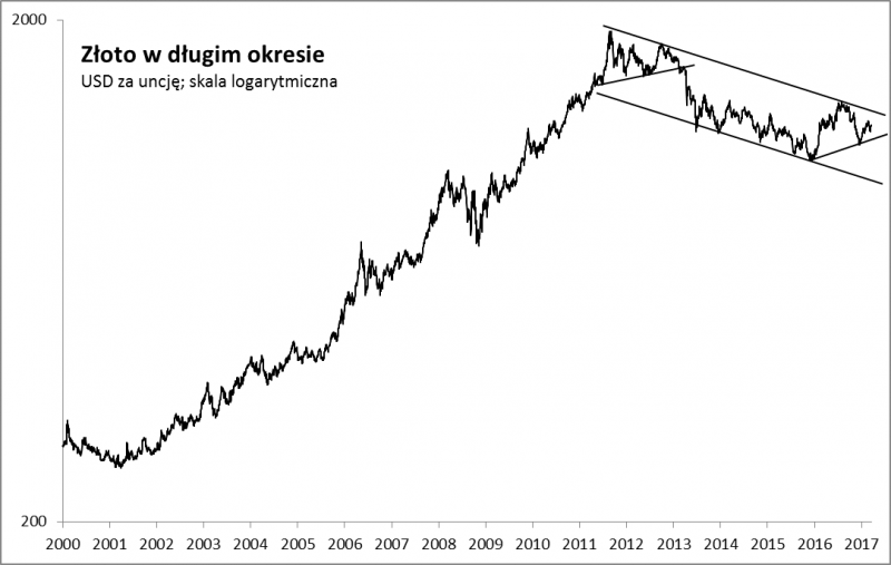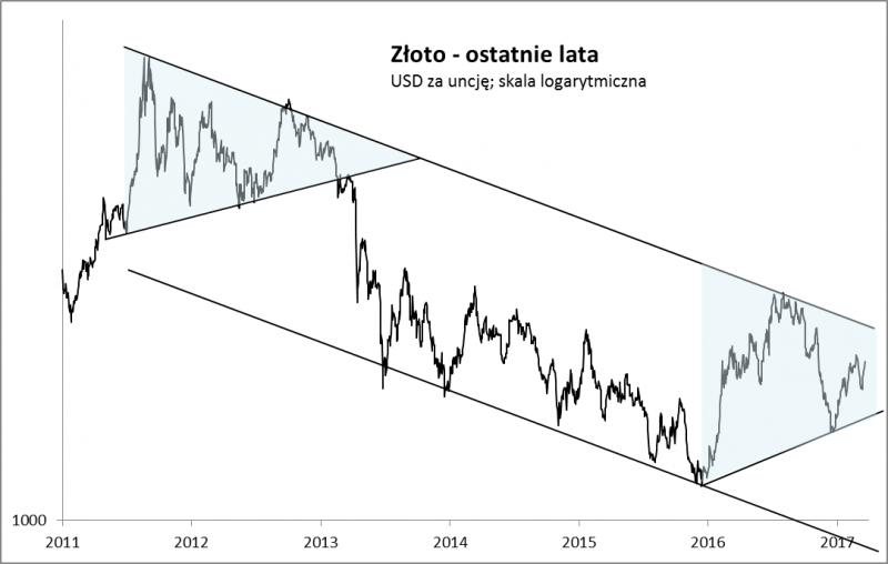 Wygląda na to, że począwszy od 2011 roku (historyczny rekord - 1900 USD za uncję) notowania złota ciągle przeżywają szeroko zakrojoną korektę wcześniejszej wieloletniej hossy. Wahania w ostatnich latach wpisują się w szeroki kanał zniżkowy. Na początku 2016 mieliśmy dynamiczne odbicie od dolnej linii kanału, zaś w połowie 2016 "zderzenie" z górną jego linią. Spójrzmy na wykres w powiększeniu.