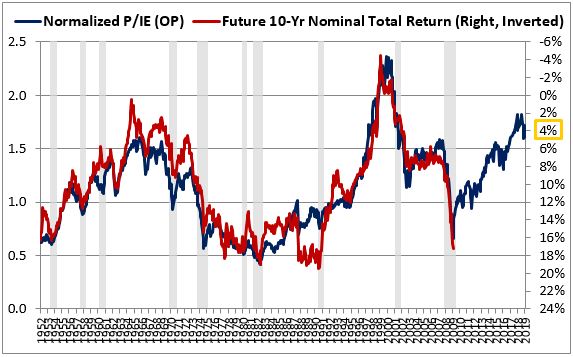 Powyższy wykres pokazuje, że 10-letnie stopy zwrotu z S&P 500 były w przeszłości silnie skorelowane z wyjściowym poziomem wskaźnika P/IE, czyli Price/Integrated Equity. Owe "Integrated Equity" to suma wszystkich historycznych zysków zatrzymanych (czyli nie wypłaconych akcjonariuszom), skorygowanych każdorazowo o inflację. Autor argumentuje, że jest to wskaźnik lepszy zarówno od P/E (cena/zysk), jak i P/B (cena/wartość księgowa).