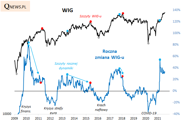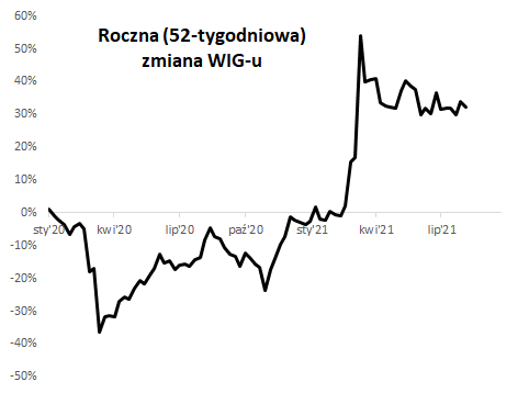 Podczas gdy indeks WIG bije w ostatnim czasie rekordy, to jego roczna dynamika szczyt ustanowiła jeszcze w marcu i jest już wyraźnie niżej niż wtedy (32% wobec prawie 54% wg danych tygodniowych).