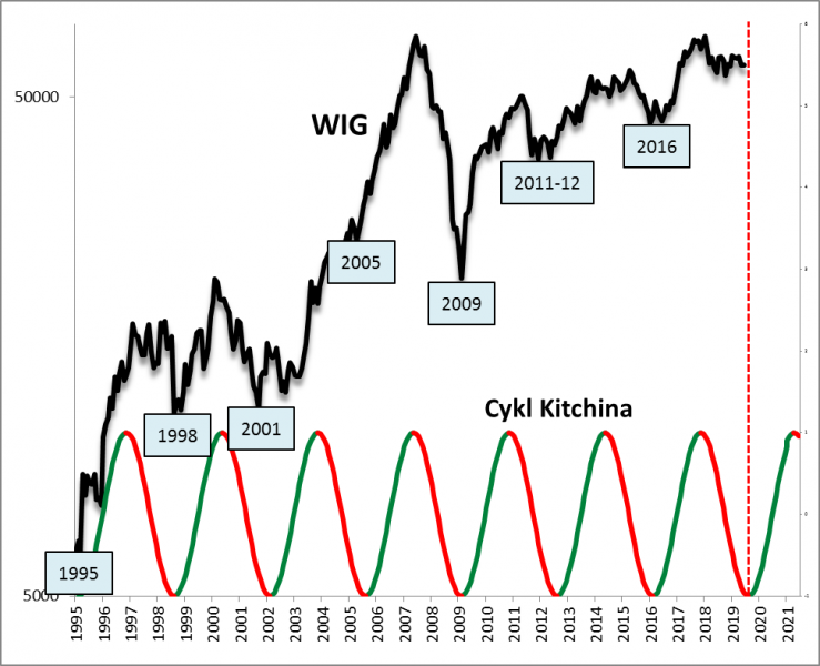 Gdyby bazować wyłącznie na sprawdzonym cyklu Kitchina, można by założyć, że mamy kulminację strachu na rynkach i okazję do akumulowania akcji. Ale tym razem pojawia się wątpliwość jakiej nie było od 1998 roku – alternatywny, „duży” cykl ostrzega przed końcem dziesięcioletniej ekspansji.