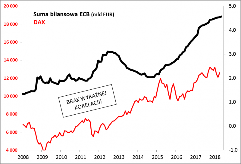 Zbliżający się koniec QE będzie zasadniczo problemem dla rynków akcji tylko wtedy, gdy gospodarka eurolandu zacznie na nowo popadać w tarapaty. Warto podkreślić, że historycznie ciężko było się dopatrzyć wyraźnego związku między wielkością sumy bilansowej ECB, a zmianami indeksów giełdowych w Europie, np. niemieckiego DAX-a.