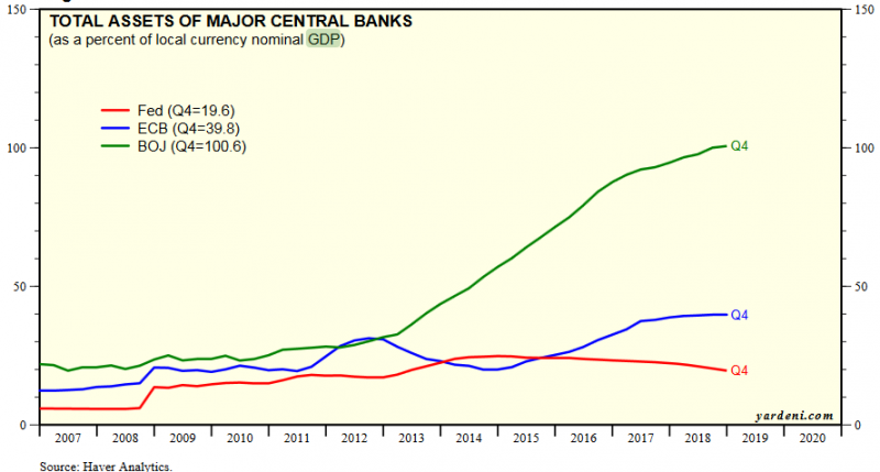 Jednocześnie nawet po ustabilizowaniu nominalnego poziomu, wielkość aktywów Fedu będzie potem powoli maleć względem PKB. Już teraz zresztą pod tym względem suma bilansowa Fedu jest dużo bardziej "normalna" (19,6% PKB na koniec IV kw. 2018) w porównaniu z liderami luzowania z ostatnich lat, czyli Bankiem Japonii i ECB.