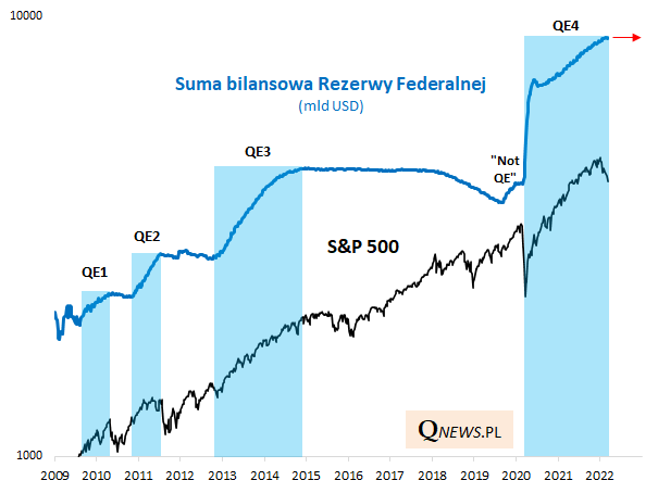 Trwająca oficjalnie od marca 2020 czwarta runda QE swymi rozmiarami przewyższyła nawet dotychczasowego rekordzistę (QE3). Łącznie przez dwa lata od czasu ogłoszenia przez Fed "nieograniczonego luzowania" w reakcji na wybuch pandemii i lockdown gospodarki suma bilansowa Fedu - od 2008 roku traktowana jako jeden z głównych parametrów polityki banku centralnego - urosła o ponad 4,5 BILIONA dolarów, ulegając podwojeniu.