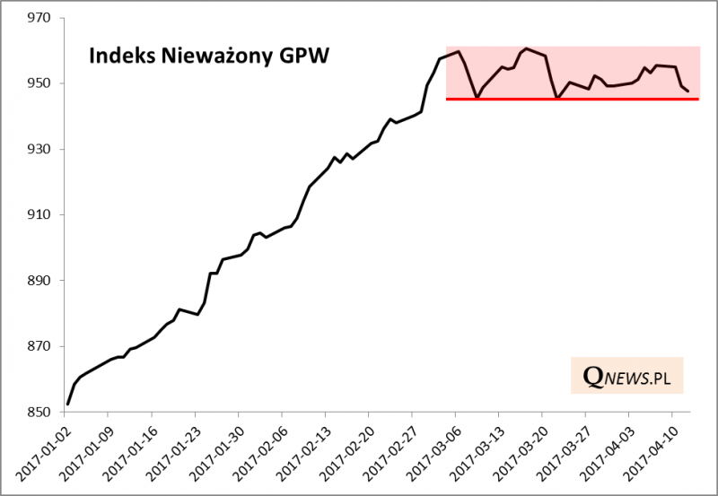 W razie takiego rozwoju zdarzeń będziemy czekać na zejście wskaźników nastrojów (np. naszego Barometru) - które jeszcze niedawno bujały w obłokach - do neutralnych poziomów (co byłoby spójne z wystrzałem "indeksu strachu" w USA). Warto przy okazji zwrócić uwagę na obliczany przez nas Indeks Nieważony GPW (każda spółka ma identyczny wpływ na jego zmiany). Po niemal nieprzerwanej fali wzrostowej trwającej od grudnia aż do początków marca indeks ten jest w wąskim trendzie bocznym. Przebicie poziomów wsparcia mogłoby zwiastować wejście całego rynku w fazę korekty ostatnich zwyżek.