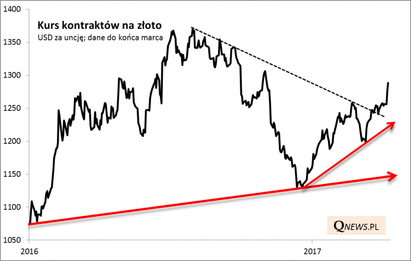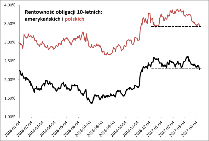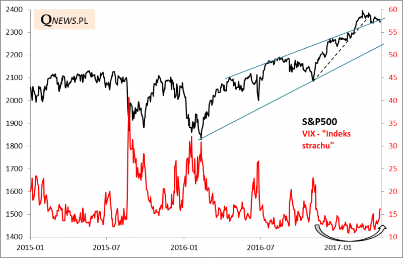 Coś ciekawego zaczyna dziać się na rynkach finansowych. Bezpośrednio pod wpływem rosnącego ryzyka geopolitycznego (Syria, Korea Płn., wybory we Francji), choć kontekst tych wydarzeń jest dużo szerszy. Powolnemu korygowaniu się amerykańskiego S&P500 ze szczytu hossy odnotowanego na początku marca towarzyszy stopniowe wychodzenie "indeksu strachu" (VIX) ze strefy bardzo niskich odczytów. Fani analizy technicznej na wykresie VIX-a dopatrzyć się pewnie mogą formacji "spodka". We wtorek indeks strachu znalazł się najwyżej od pięciu miesięcy, ale jest to poziom ciągle na tyle niski, że dalszy wzrost tego wskaźnika nie byłby niczym zaskakującym. Za okazje do zakupów można by uznać wartości VIX-a  na poziomie co najmniej lokalnego szczytu z listopada (23 pkt.), a przecież w trakcie wcześniejszych korekt potrafił wystrzelić jeszcze wyżej (aż 40 pkt. w sierpniu 2015).