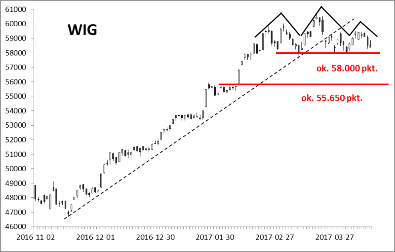 Osłabł też rynek akcji w Warszawie. Na wykresie WIG czy WIG20 fani kresek dopatrzyć się mogą czegoś w rodzaju formacji "głowy z ramionami". Po ewentualnym przebiciu "linii szyi" indeksy te zgodnie z książkowym schematem otworzyłyby sobie drogę do zejścia ku kolejnemu poziomowi wsparcia (55.650 pkt. w przypadku WIG - poziom poprzednio notowany jeszcze na początku lutego).