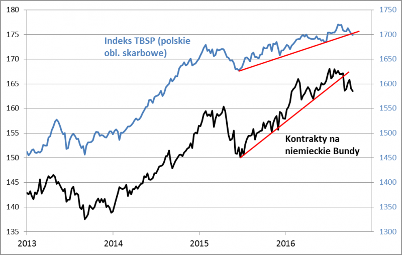 Coś ciekawego dzieje się z notowaniami obligacji na globalnych rynkach w ostatnich tygodniach. Oczekiwania na grudniową podwyżkę stóp procentowych w USA, plotki (oficjalnie zdementowane) na temat stopniowego ograniczania wielkości skupu aktywów w ramach QE w strefie euro, a wreszcie proinflacyjny wzrost cen ropy naftowej - wszystko to wywołało wyraźny wzrost rentowności papierów skarbowych z relatywnie niskich poziomów. Dochodowość 10-letnich obligacji amerykańskich po raz pierwszy od czerwca podniosła się powyżej 1,70%, a niemieckich wyszła powyżej zera. Mocno podskoczyła rentowność papierów brytyjskich - tu w grę dodatkowo wchodzi proinflacyjne osłabienie funta. W ślad za tzw. rynkami bazowymi podążyła też rentowność polskich 10-latek, która znalazła się na nowo powyżej progu 3%.