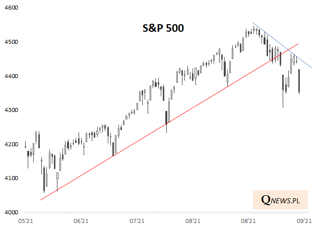 Zwróćmy uwagę na cały szerszy kontekst sytuacji - S&P 500 ma za sobą przebicie linii trendu wzrostowego poprowadzonej po serii lokalnych dołkach począwszy od maja. Z kolei górka odreagowania z ostatnich dni wraz z wcześniejszymi szczytami zaczęła właśnie tworzyć dla odmiany opadającą linię trendu spadkowego. I to ona stanowi teraz kluczowy poziom.