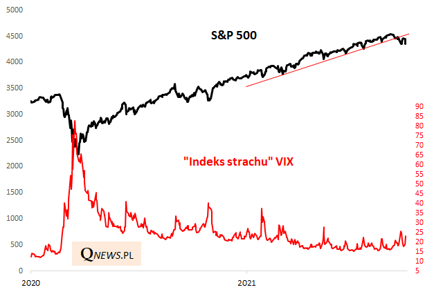 Zastanawiające jest, że mimo dość burzliwego września nie obserwujemy znaczącego wzrostu "indeksu strachu", czyli wskaźnika VIX. W trakcie większych korekt na przestrzeni ostatnich kilkunastu miesięcy potrafił on podskoczyć sporo powyżej 30 pkt. (nie wspominając już o wystrzałach takich jak w trakcie pandemicznego krachu, ale to akurat wyjątkowe sytuacje). Tymczasem wczorajszą sesję zakończył na poziomie 23 pkt.