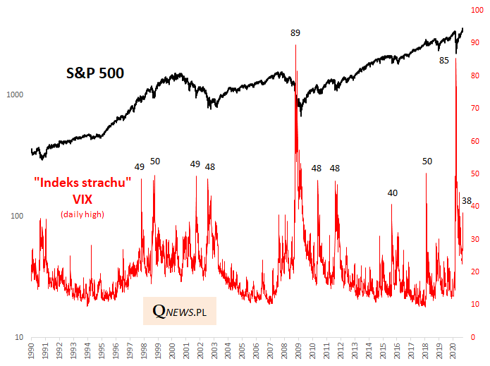 W tym kontekście kluczowe jest pytanie jak mocno może się skorygować "indeks strachu"? Zerknijmy na długi okres. Dojście VIX do pułapu 48-50 pkt. sygnalizowało punkt kulminacyjny wielu mocniejszych korekt spadkowych (wyższe poziomy pojawiały się wyłącznie w trakcie rzadko występujących krachów) - w ostatnich dniach wskaźnik doszedł maksymalnie do 38 pkt.