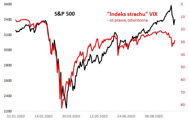 Na podstawie poniższego wykresu wydaje się, że S&P 500 najpierw zawędrował wyżej niż wynikałoby z korelacji ze wskaźnikiem VIX, popularnie zwanym "indeksem strachu" (pokazuje tzw. implikowaną zmienność notowań na podstawie rynku opcji), a potem podążył w dół za korygującym się wskaźnikiem.
