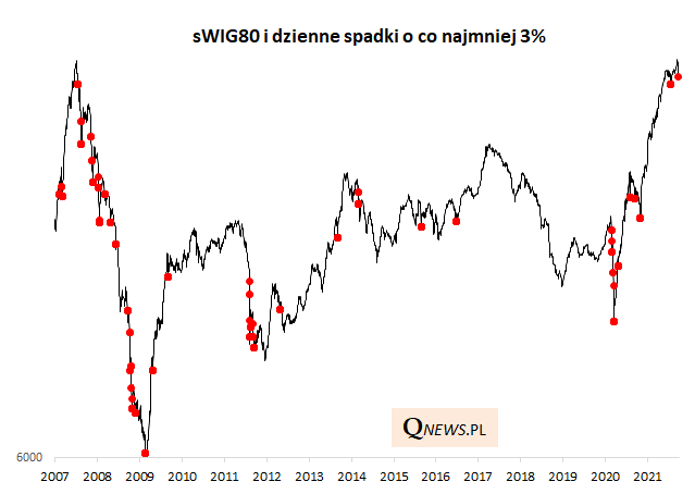 Historia nie daje jednoznacznej odpowiedzi na pytanie czy mocny dzienny spadek to okazja do zakupów. Faktycznie odnotowaliśmy kilka przypadków, kiedy takie tąpnięcie kończyło korektę (w przypadku np. sWIG80 jak na wykresie), ale zdarzały się również epizody, w których mocne dzienne przeceny występowały w seriach.