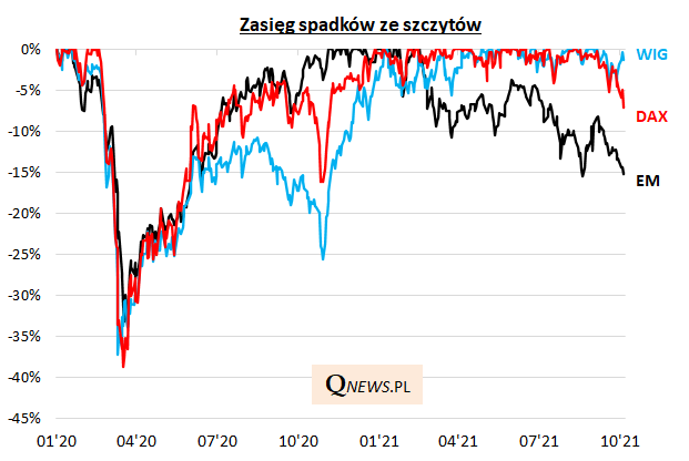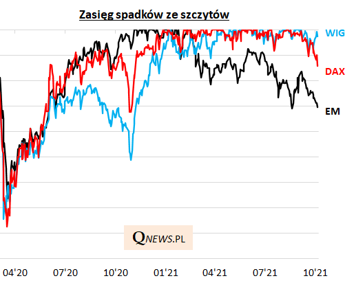 Jesteśmy dwa miesiące później i widać, że z jednej strony mimo prób odreagowania indeks MSCI Emerging Markets znów przymierza się do testowania letnich dołków, a z drugiej rynki rozwinięte zaczęły się w końcu uginać pod presją. Najnowszym tego przykładem jest niemiecki indeks DAX, w przypadku którego rozmiary korekty spadkowej są już największe od jesieni 2020 (sam indeks znalazł się z kolei najniżej od maja br.).
