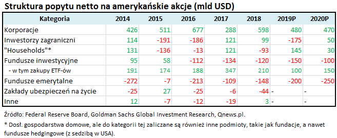Ogółem widać, że korporacje są najstabilniejszym i najpotężniejszym źródłem popytu netto na amerykańskie akcje. I tak zdaniem GS ma pozostać w przyszłym roku – zakupy netto spółek mają zmaleć tylko nieznacznie, do 470 mld dolarów. Fundusze emerytalne i inwestycyjne jako całość mają nadal sprzedawać walory. Sytuacja ma się poprawić natomiast jeśli chodzi m.in. o inwestorów zagranicznych.