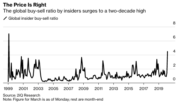 Wg cytowanych przez Bloomberga danych firmy 2iQ Research obserwującej działania ponad 200 tys. insiderów w ponad 60 tys. spółek na świecie widać potężną falę popytu z ich strony. Współczynnik wartości transakcji kupna wględem sprzedaży (buy-sell ratio) osiągnął poziom niewidziany nawet w trakcie paniki po upadku Lehman Brothers.
