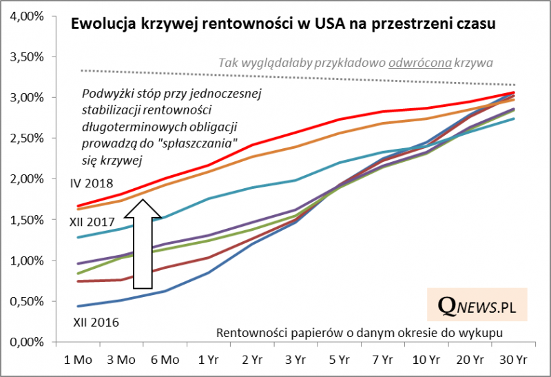 Spłaszczenie (flattening), gdyby nadal postępowało, w którymś momencie może doprowadzić do "odwrócenia" krzywej (inversion), czyli do sytuacji, w której krótkoterminowe papiery skarbowe są bardziej rentowne niż te o długim terminie do wykupu. Na razie nie mamy do czynienia z taką sytuacją - to dobra wiadomość - ale na horyzoncie już widać taką możliwość w perspektywie wielu miesięcy.