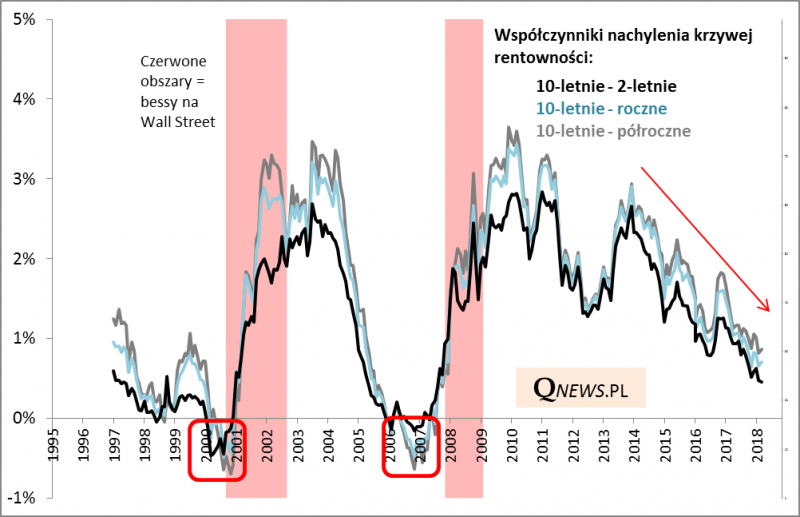 Cały czas podkreślamy, że odwrócenie krzywej byłoby sygnałem alarmowym najwyższej rangi, bo historycznie sygnał taki zapowiadał recesje, a często też bessy, w tym dwie z ostatnich dwudziestu lat. Tego sygnału jeszcze nie ma, ale konsekwentnie zmierzamy w jego kierunku.