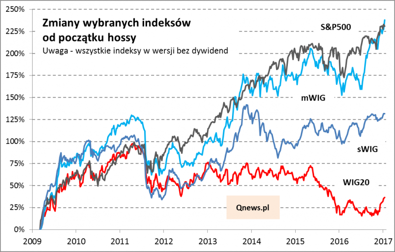 Nasz wykres można interpretować na alternatywne sposoby. Jedni powiedzą pewnie, że skoro mWIG40 jest najmocniejszy, to tylko jego warto się trzymać. Inni powiedzą, że największe zaległości (=potencjał) ma WIG20. A może każdy z nich jest wart uwagi?