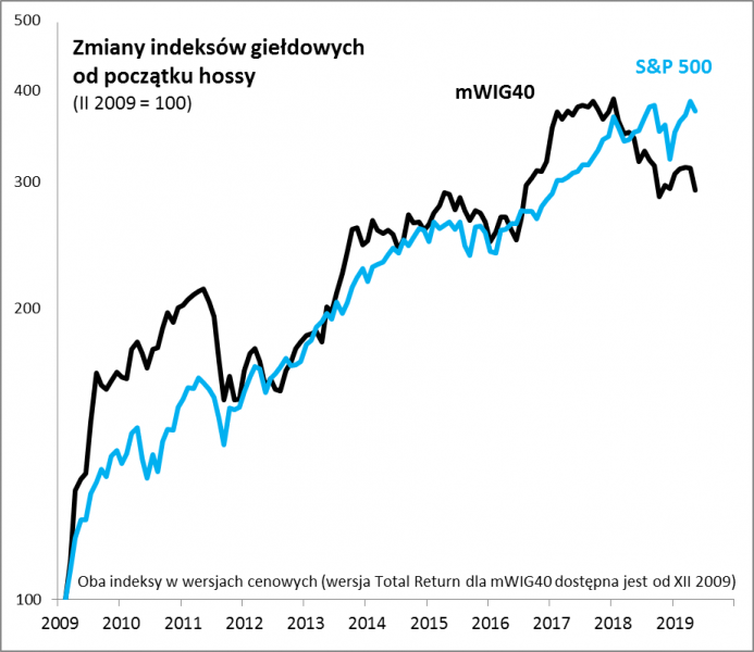 Na początku 2017 roku obwołaliśmy kojarzony ze średniej wielkości spółkami mWIG40 „królem polskich indeksów” ze względu na to że jako jedyny indeks GPW dotrzymywał kroku amerykańskiemu S&P 500. Od czasu publikacji tamtego artykułu mWIG40 swoją siłę zdołał utrzymać jeszcze przez rok, a nawet w tym okresie wyraźnie wyprzedził S&P 500. Potem było już słabiej. W ostatnich kilkunastu miesiącach indeks pozostaje już wyraźnie w tyle za amerykańskim wskaźnikiem (choć w skali całej hossy trwającej od 2009 r. i tak ciągle prezentuje się korzystnie).