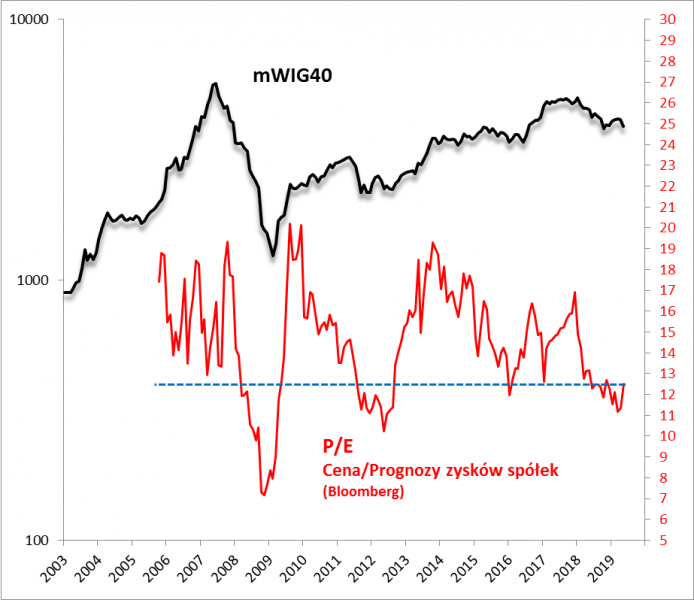 Zacznijmy od najbardziej popularnego wskaźnika P/E (cena/prognozowane zyski spółek). Spadł z pułapu prawie 17 pod koniec 2017 roku do ok. 11 w marcu. Ostatnio co prawda nieco urósł (powyżej 12) na skutek pogorszenia prognoz zysków, ale pozostaje w dolnej połówce historycznego przedziału wahań (pogorszenie prognoz w dość typowy sposób następuje zwykle z pewnym opóźnieniem względem spadku notowań).