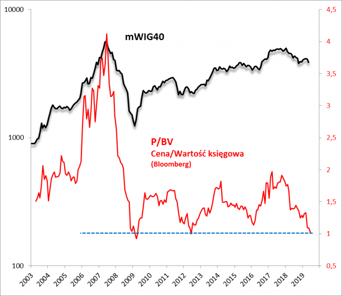 Jeszcze bardziej uatrakcyjnienie widać, jeśli spojrzymy na alternatywne wskaźniki wyceny. Relacja ceny do wartości księgowej (P/BV) spadła w trakcie kilkunastomiesięcznej wyprzedaży z ok. 1,9 do nieco ponad 1,0. Już niewiele więc brakuje, by mWIG40 był notowany poniżej swej wartości księgowej. Coś takiego miało miejsce jedynie w kulminacyjnym okresie paniki na początku 2009 roku (!). O krok od spadku poniżej wartości księgowej indeks był też w połowie 2012 roku, kiedy polski rynek został pogrążony przez obawy o losy strefy euro.