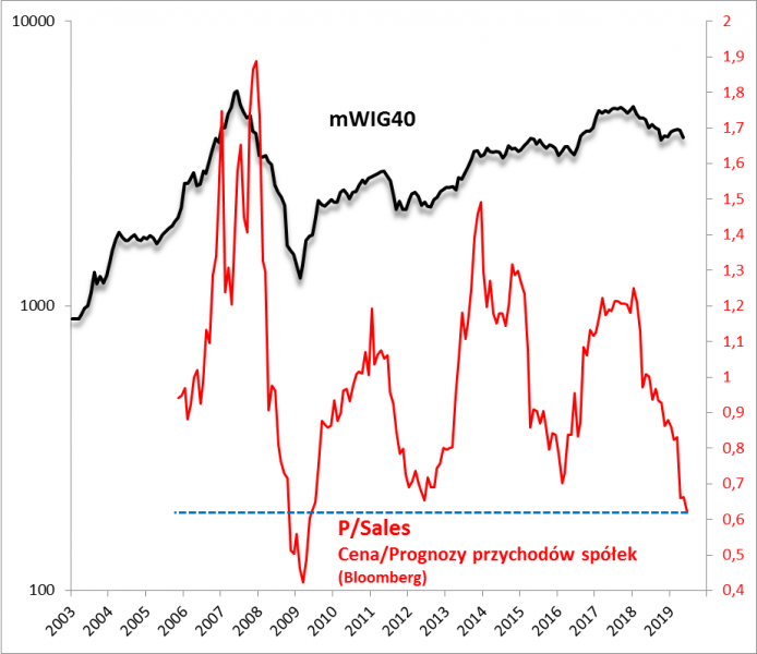 Bardzo zbliżone są konkluzje w oparciu o współczynnik ceny do prognozowanych przychodów ze sprzedaży (P/S). Według Bloomberga w styczniu 2018 wynosił w przypadku mWIG-u 1,25. A teraz? Ledwie przekracza 0,60. Niżej niż obecnie był WYŁĄCZNIE w okresie skrajnej paniki związanej z globalnym kryzysem finansowym (2008/2009).