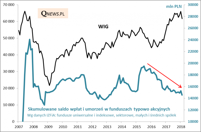 Na przestrzeni ubiegłego roku, śledząc dane na temat napływów gotówki do funduszy inwestycyjnych o typowo akcyjnym (agresywnym) profilu, konkludowaliśmy, że po raz pierwszy w historii na GPW mamy do czynienia z hossą ... bez napływów, a nawet z odpływami netto kapitałów inwestorów indywidualnych.