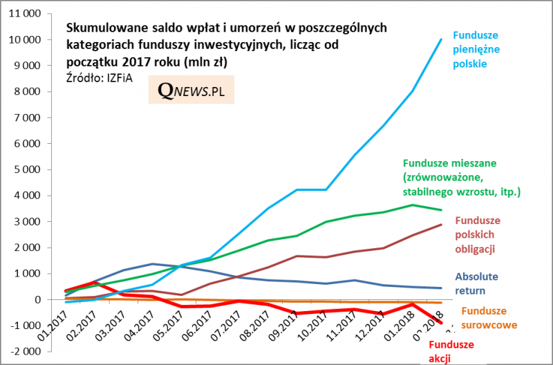 Świeżej gotówki jak widać nie brakuje, tyle tylko, że trafia ona przede wszystkim do najbardziej konserwatywnej grupy funduszy: pieniężnych. Od początku 2017 roku trafiło tam netto ponad 10 mld zł (!). Pocieszające z punktu widzenia rynku kapitałowego jest to, że pieniądze płyną też (nie licząc słabszego lutego) do szerokiej kategorii funduszy mieszanych, które część aktywów inwestują w akcje. Być może nie ma więc sensu tak bardzo rozpaczać nad systematycznym popadaniem w niełaskę funduszy typowo akcyjnych?